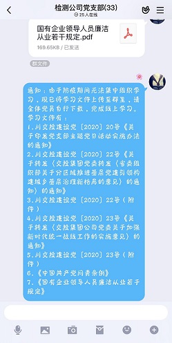 線上學習主要通過QQ群上傳文件及通知,要求大家自行下載學習了川交投建設黨〔2020〕20號《關于印發黨支部主題黨日活動實施辦法的通知》、川交投建設黨〔2020〕22號《關于轉發〈交投集團黨委轉發〈省委組織部關于分區域推進基層黨建引領構建城鄉基層治理新格局的意見〉的通知〉的通知》以及川交投建設黨〔2020〕23號《關于轉發〈交投集團公司黨委關于加強新時代統一戰線工作的實施意見〉的通知》等文件精神,全面貫徹落實上級黨委各項工作要求的同時,始終緊盯責任落實,堅持責任擔當。