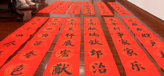 此次活動共邀請了公司的15名書法愛好者寫春聯和斗方。在活動現場,他們跟隨老師的指導揮毫潑墨,一副副散發著墨香的春聯和福字轉眼就鋪滿了活動室的大半空間。活動室里除了奮筆疾書的“書法家”們,還有從一線項目趕回來的職工,他們一邊幫忙壓紙、傳遞,一邊欣賞著墨跡未干的春聯和斗方。其中,由總工程師何文龍同志書寫的福字和春聯受到了大家一致歡迎和熱捧,整個活動現場墨香撲鼻,喜慶盈盈,構成了一道獨特的年俗文化風景。