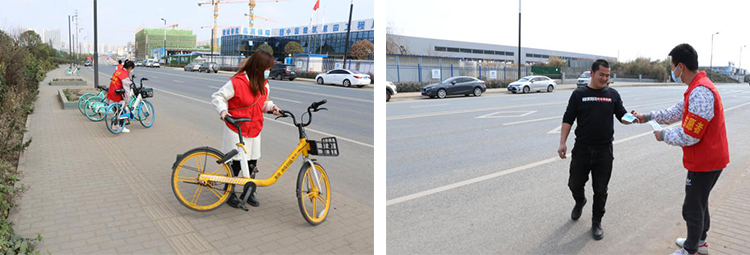 蜀工檢測(cè)公司志愿者們整理擺放共享單車、文明勸導(dǎo)路人佩戴口罩