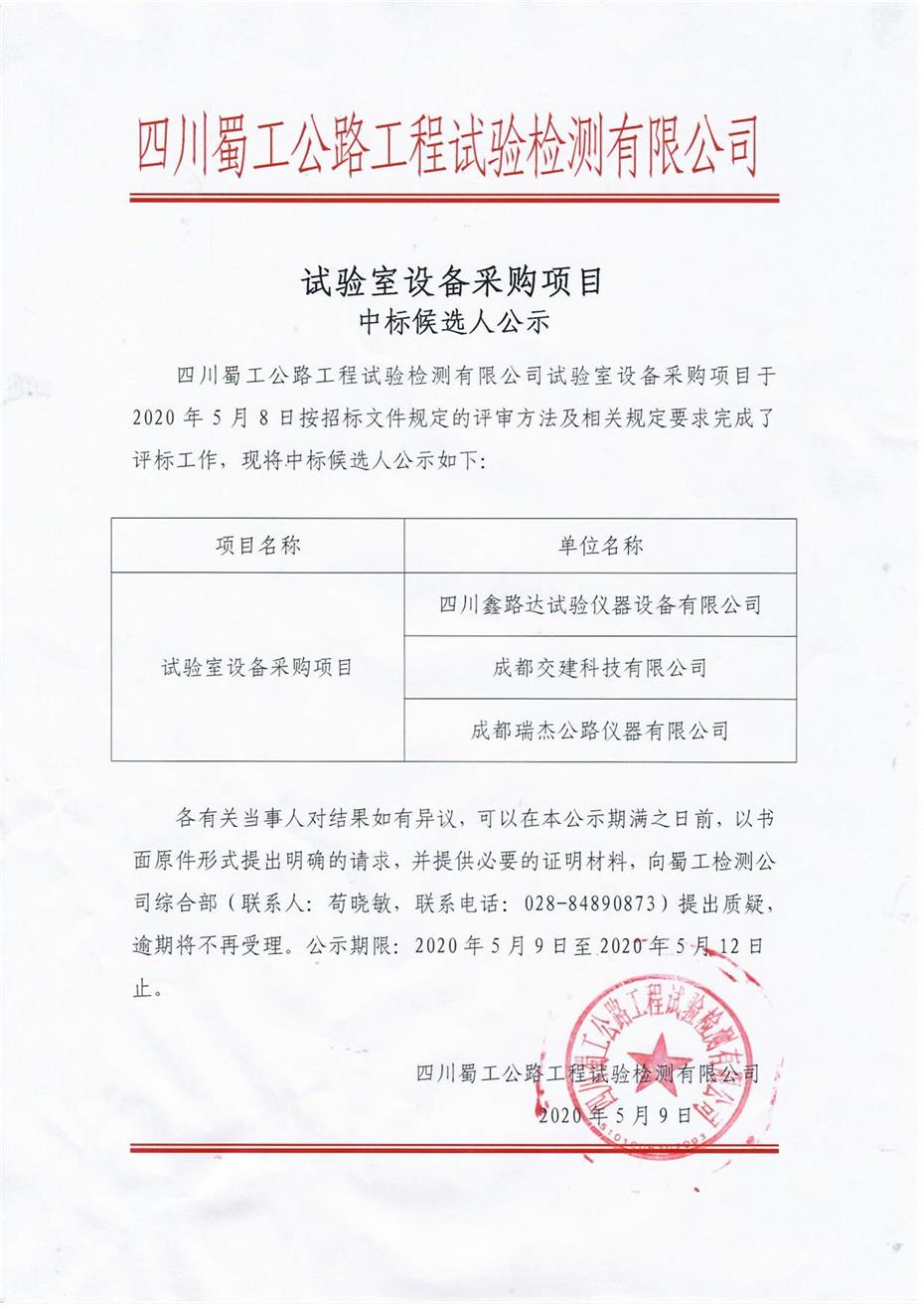 我公司試驗室設備采購項目于2020年5月8日按招標文件規定的評審方法及相關規定要求完成了開標、評標工作。現對評標結果予以公示,接受社會監督。