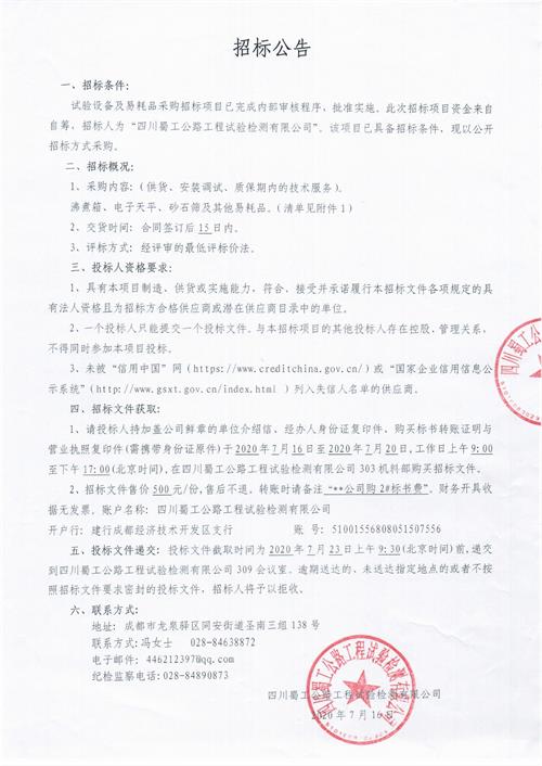 試驗設備及易耗品采購公開招標公告