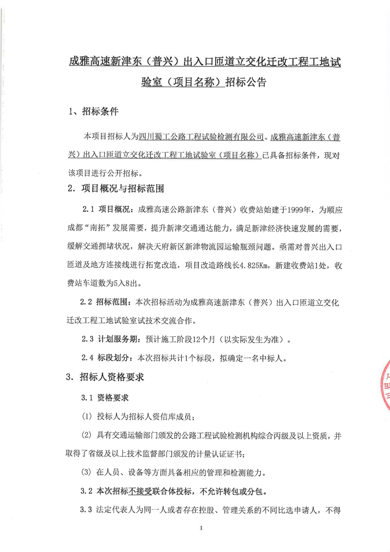 成雅高速新津東(普興)出入口匝道立交化遷改工程工地試驗室招標(biāo)公告