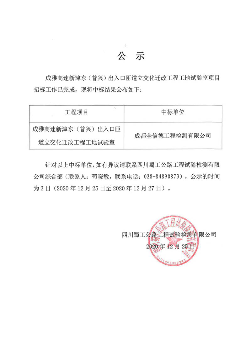 成雅高速新津東(普興)出入口匝道立交化遷改工程工地試驗室中標公示