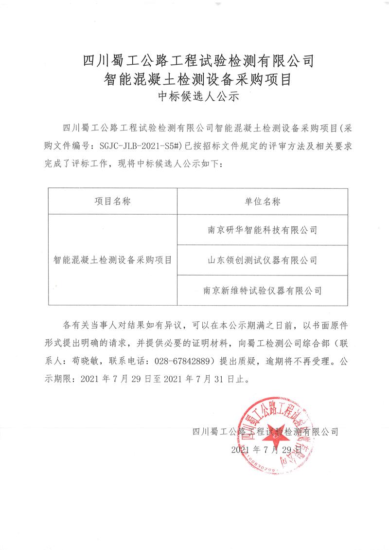 智能混凝土檢測設(shè)備采購項目中標候選人公示