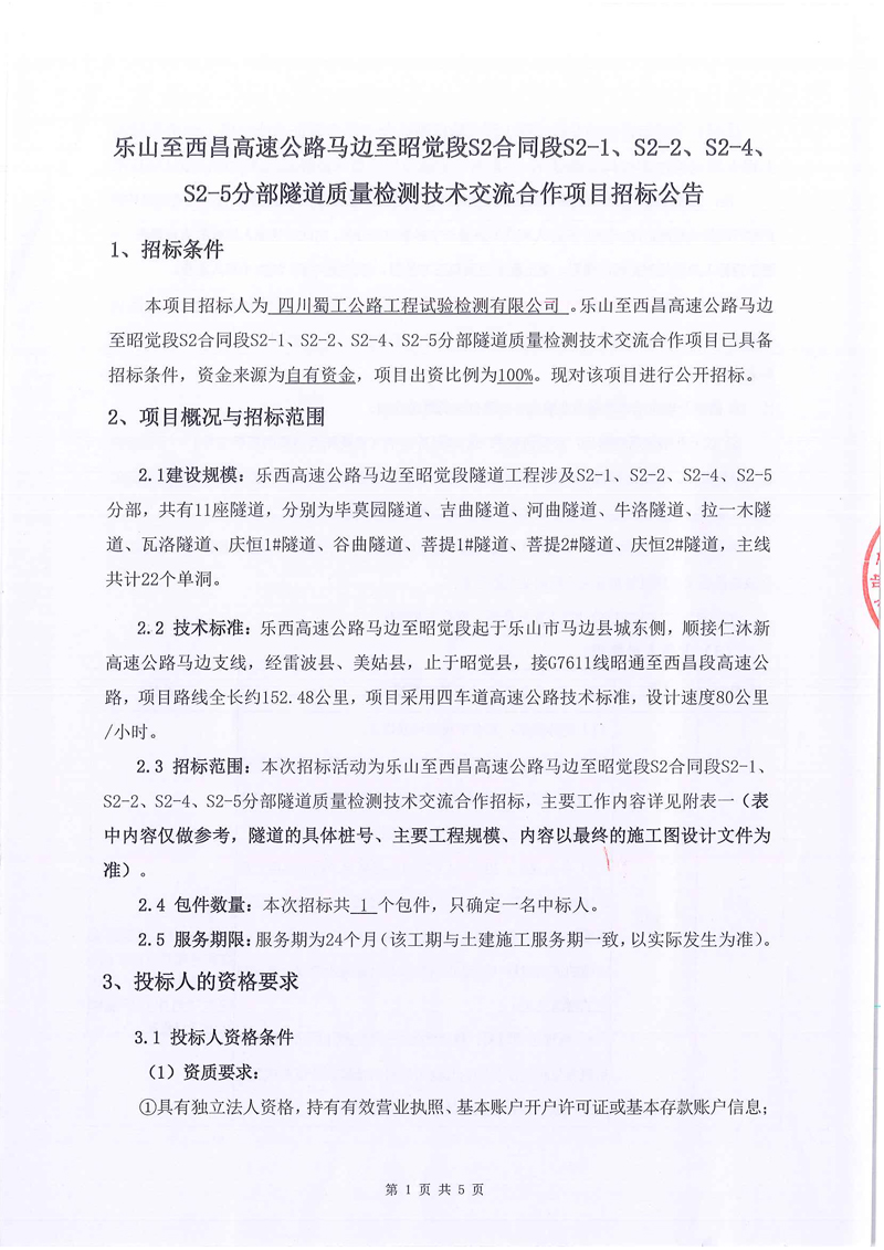 樂山至西昌高速公路馬邊至昭覺段S2合同段S2-1、S2-2、S2-4、S2-5分部隧道質量檢測技術交流合作項目招標公告