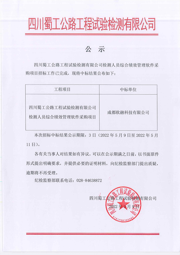 中標公示:四川蜀工公路工程試驗檢測有限公司檢測人員綜合績效管理軟件采購
