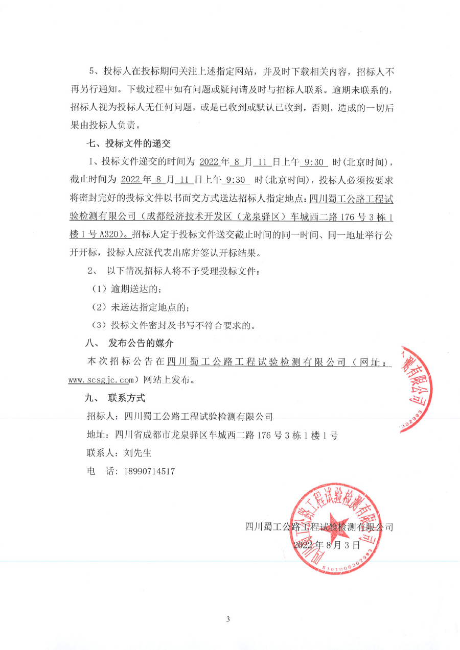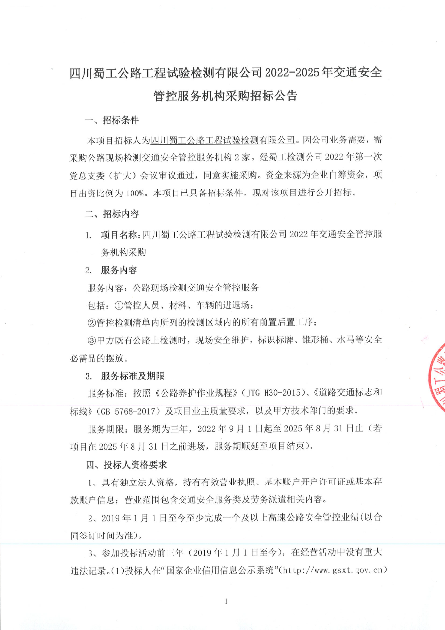 四川蜀工公路工程試驗檢測有限公司2022-2025年交通安全管控服務機構采購招標公告