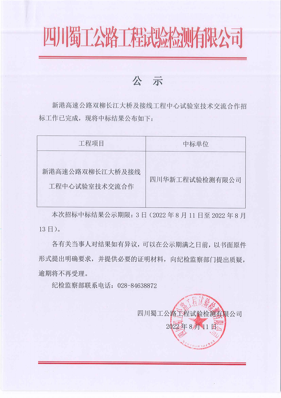 中標公示:新港高速公路雙柳長江大橋及接線工程中心試驗室技術交流合作