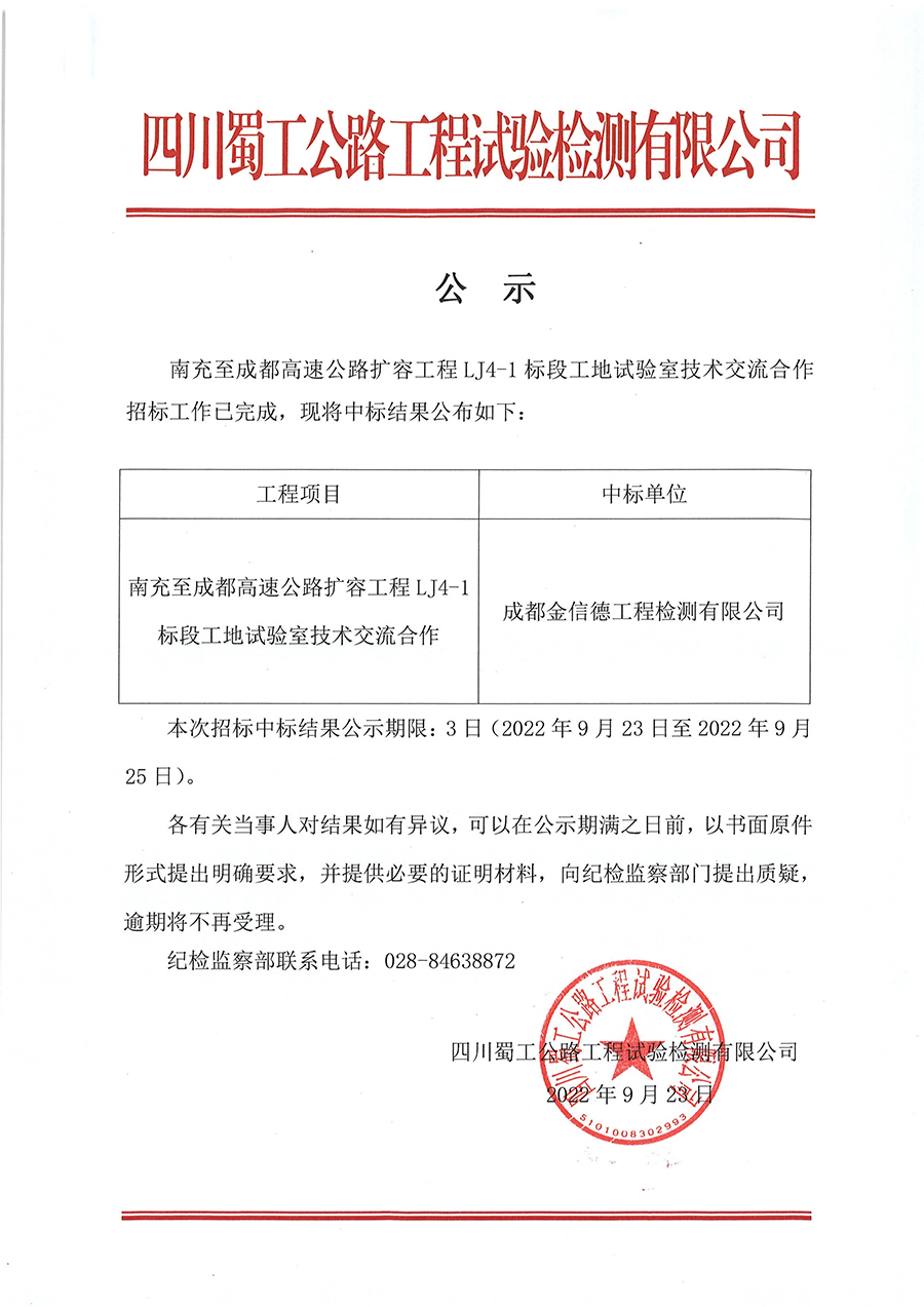 中標公示|南充至成都高速公路擴容工程LJ4-1標段工地試驗室技術交流合作