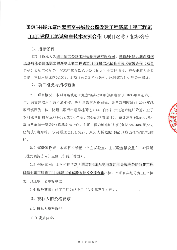 招標公告|國道544線九寨溝雙河至縣城段公路改建工程路基土建工程施工LJ1標段工地試驗室技術交流合作