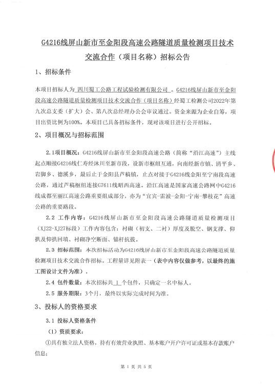 招標公告:G4216線屏山新市至金陽段高速公路隧道質量檢測項目技術交流合作