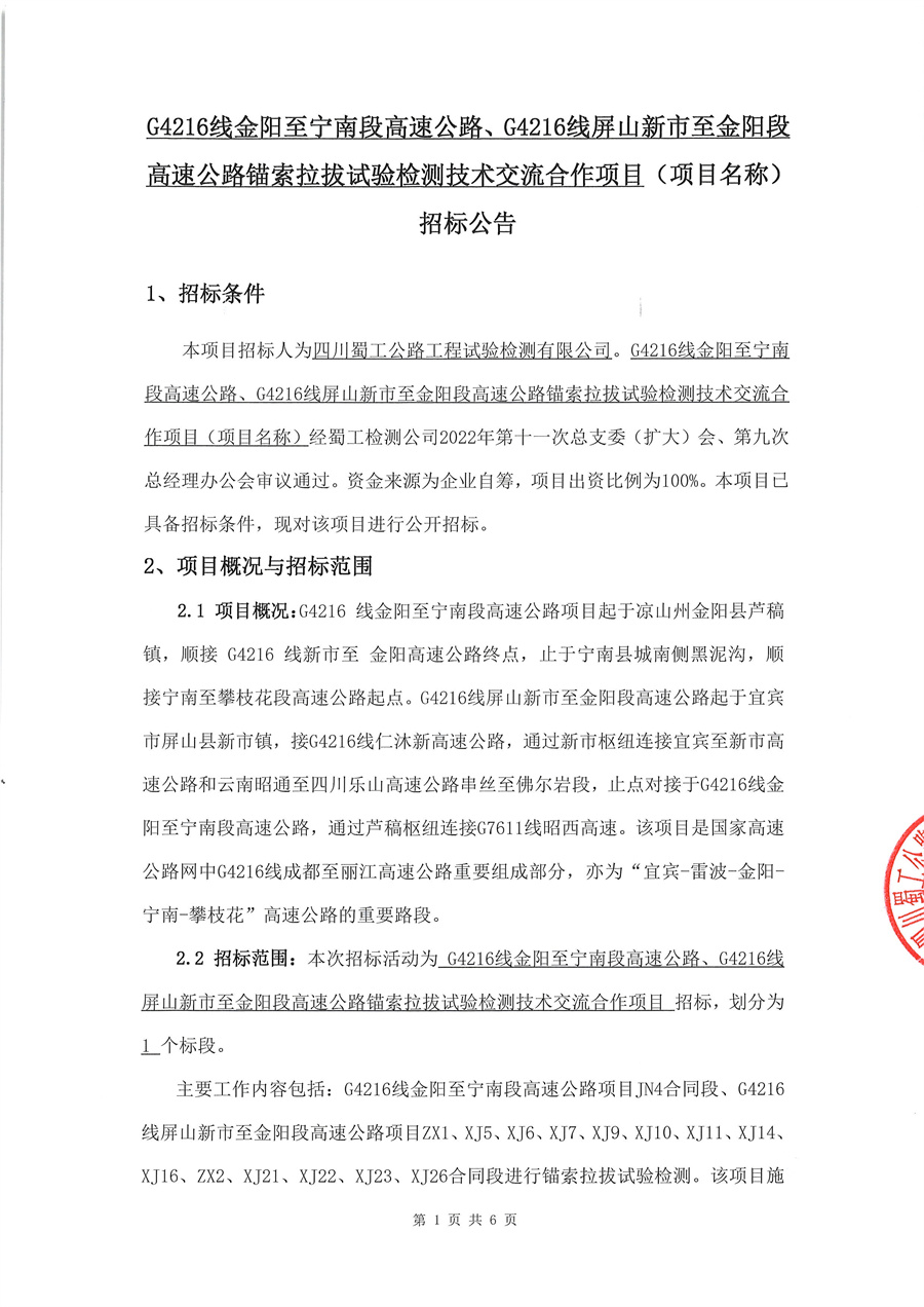 G4216線金陽至寧南段高速公路、G4216線屏山新市至金陽段高速公路錨索拉拔試驗檢測技術交流合作項目招標公告