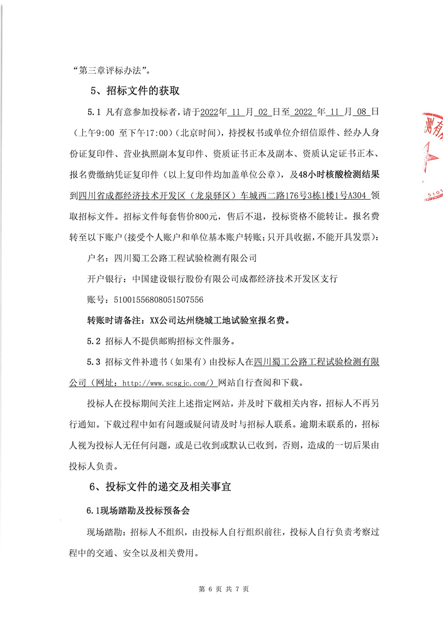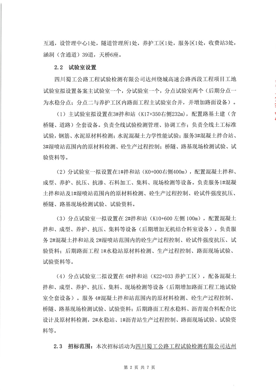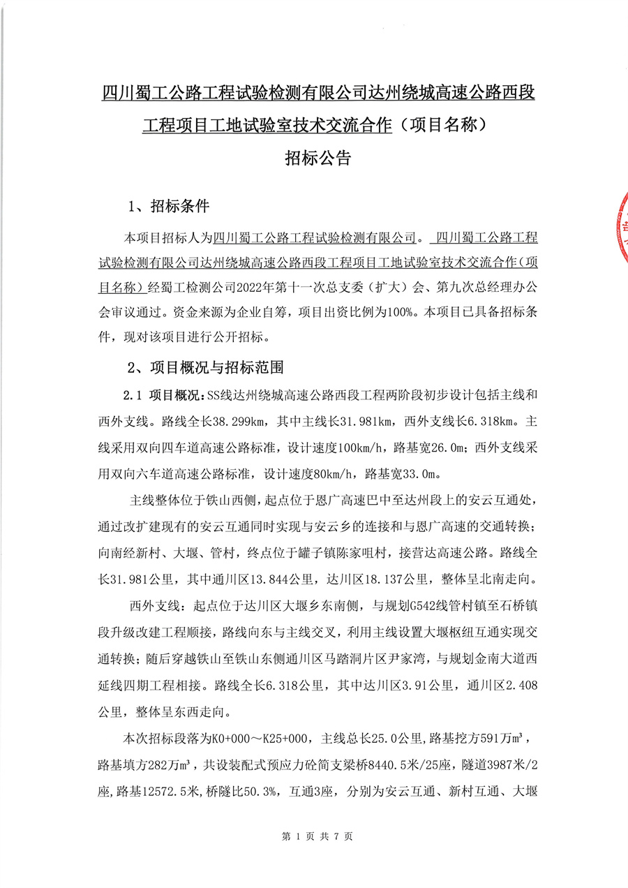 四川蜀工公路工程試驗檢測有限公司達州繞城高速公路西段工程項目工地試驗室技術交流合作招標公告