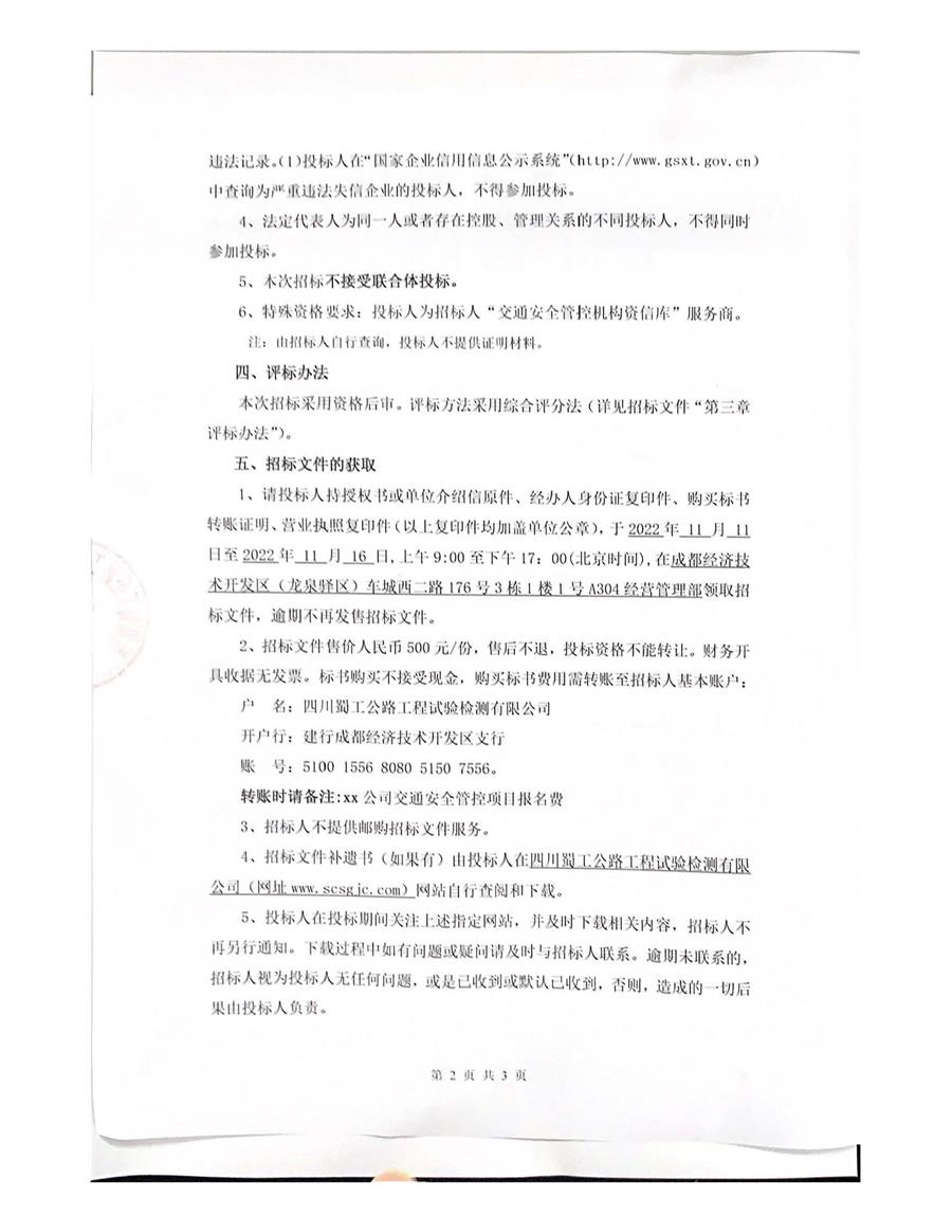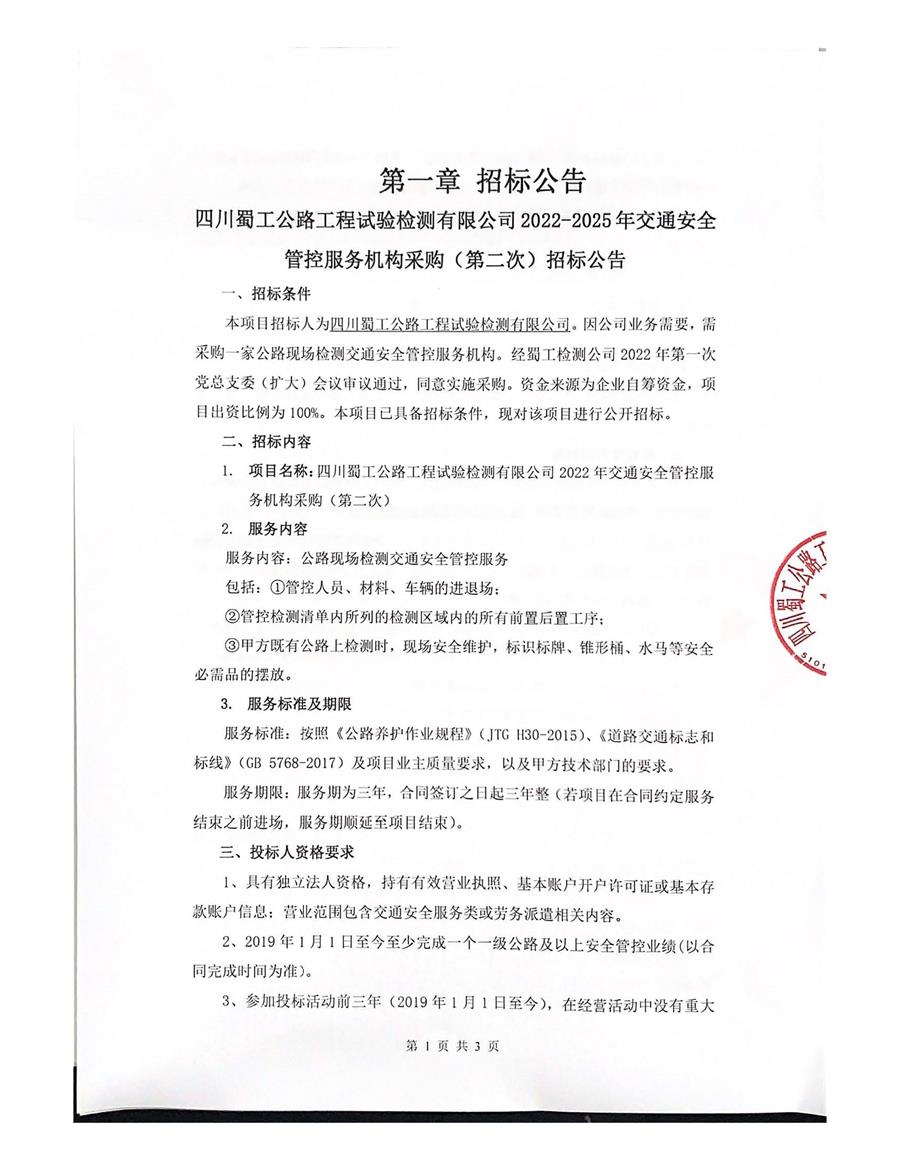 蜀工檢測公司2022-2025年交通安全管控服務機構采購(第二次)招標公告