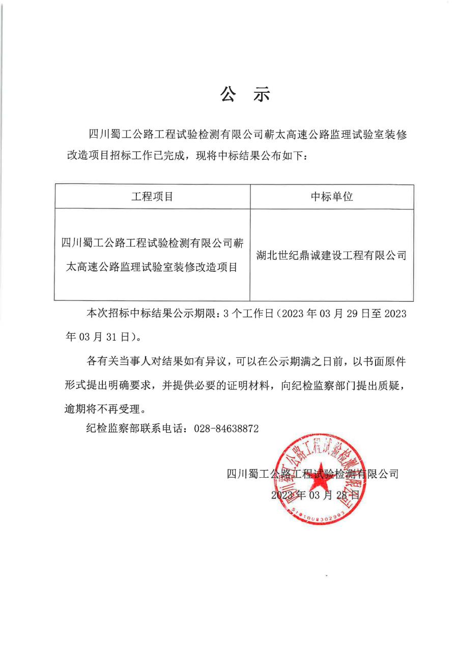 四川蜀工公路工程試驗檢測有限公司蘄太高速公路監(jiān)理試驗室裝修改造項目中標公示