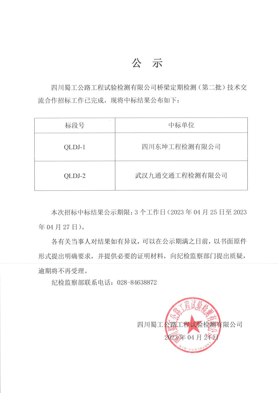 四川蜀工公路工程試驗檢測有限公司橋梁定期檢測(第二批)技術交流合作中標公示