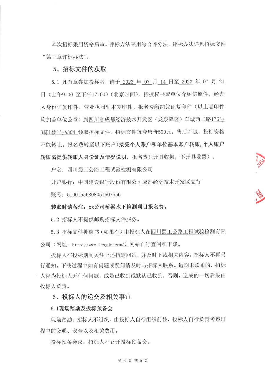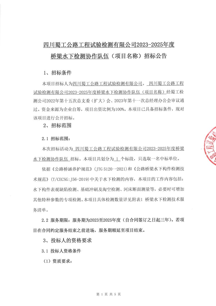 四川蜀工公路工程試驗檢測有限公司2023-2025年度橋梁水下檢測協作隊伍招標公告