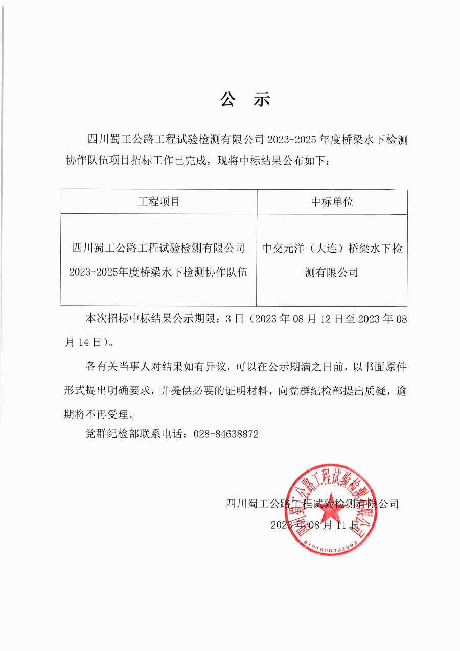 四川蜀工公路工程試驗檢測有限公司2023-2025年度橋梁水下檢測協(xié)作隊伍項目中標(biāo)公示