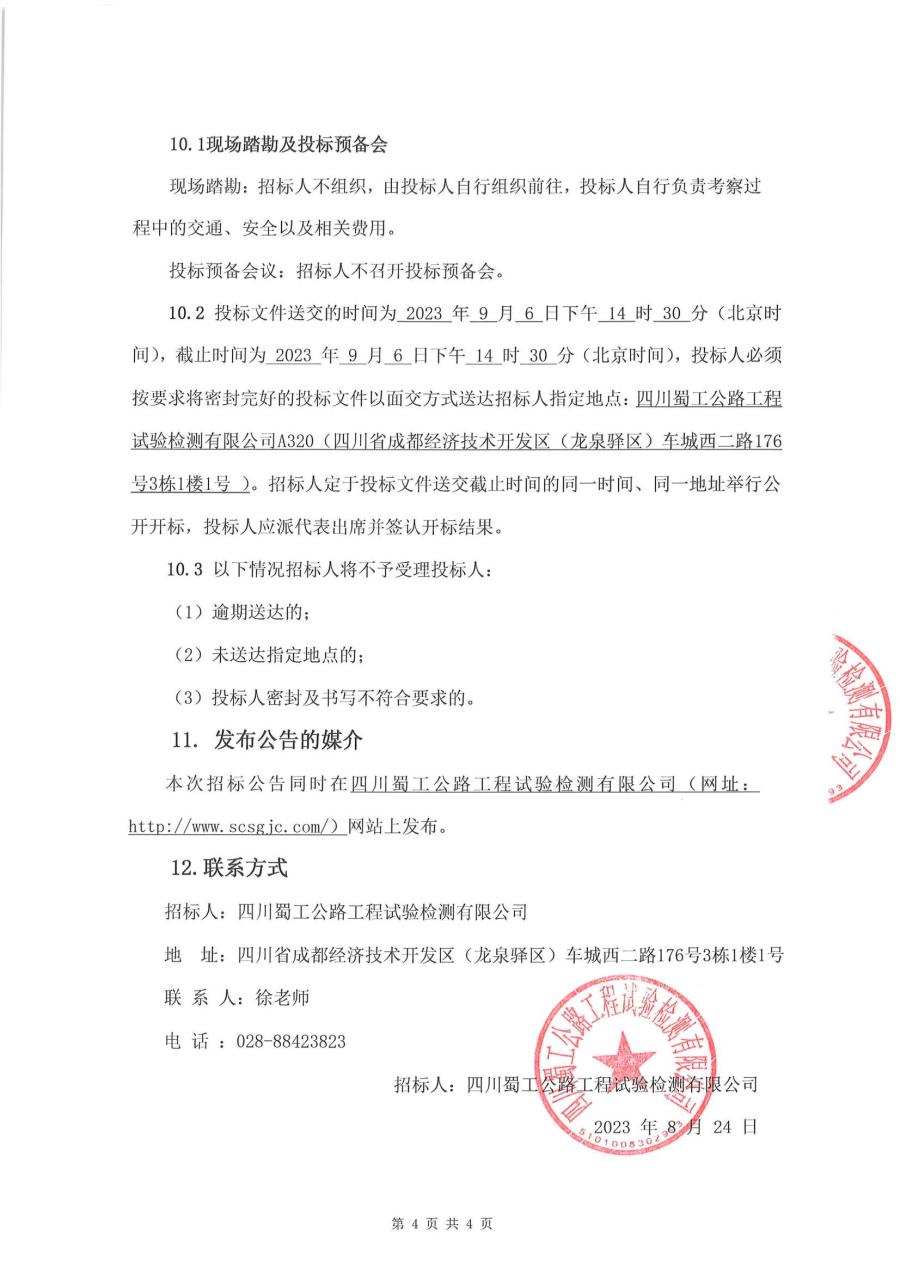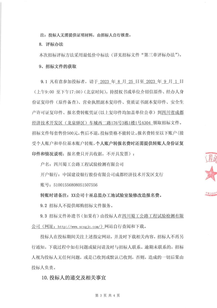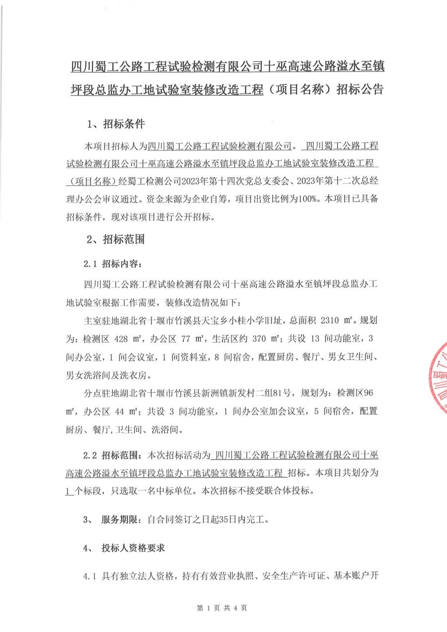 四川蜀工公路工程試驗檢測有限公司十巫高速公路溢水至鎮坪段總監辦工地試驗室裝修改造工程招標公告