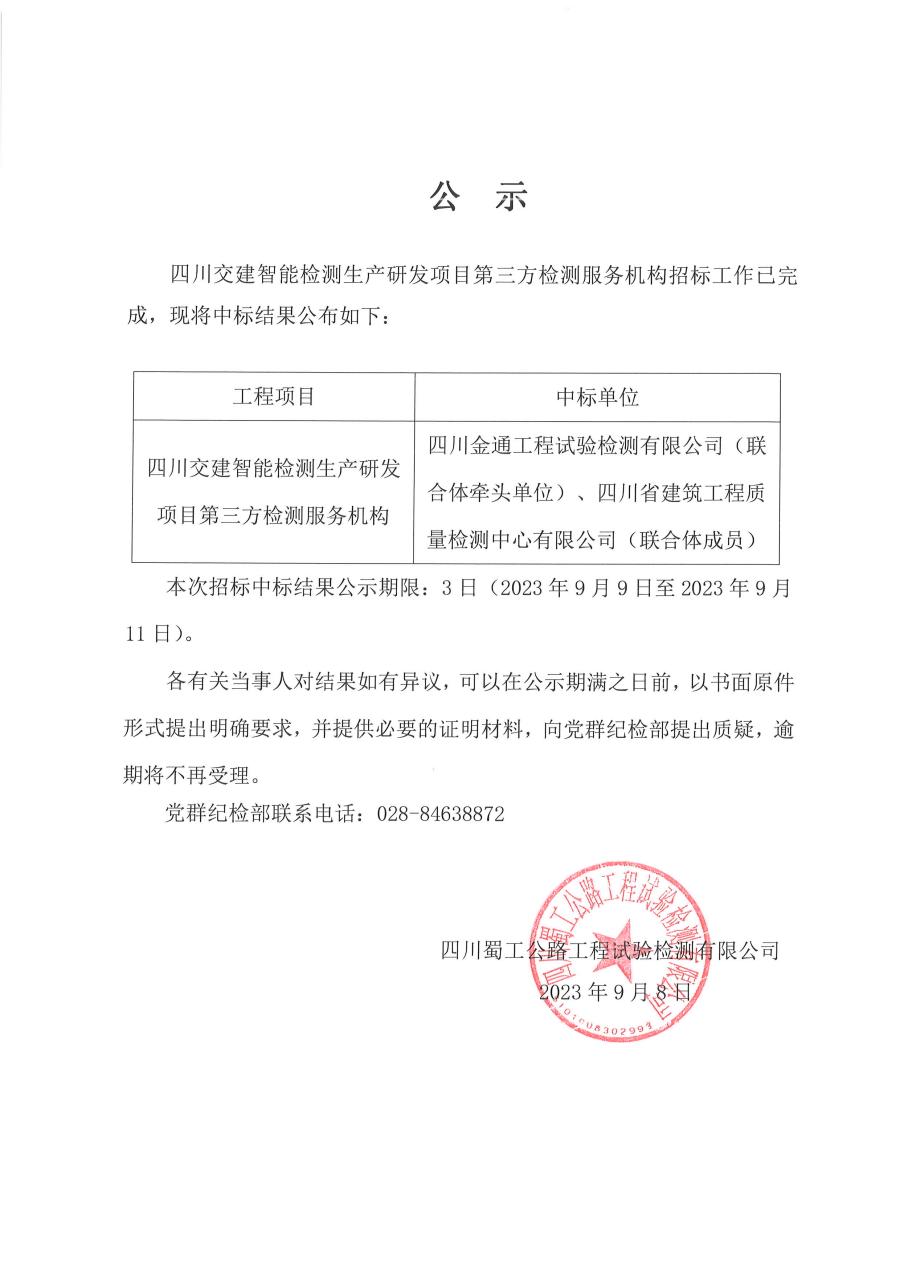 四川交建智能檢測生產研發項目第三方檢測服務機構中標公示