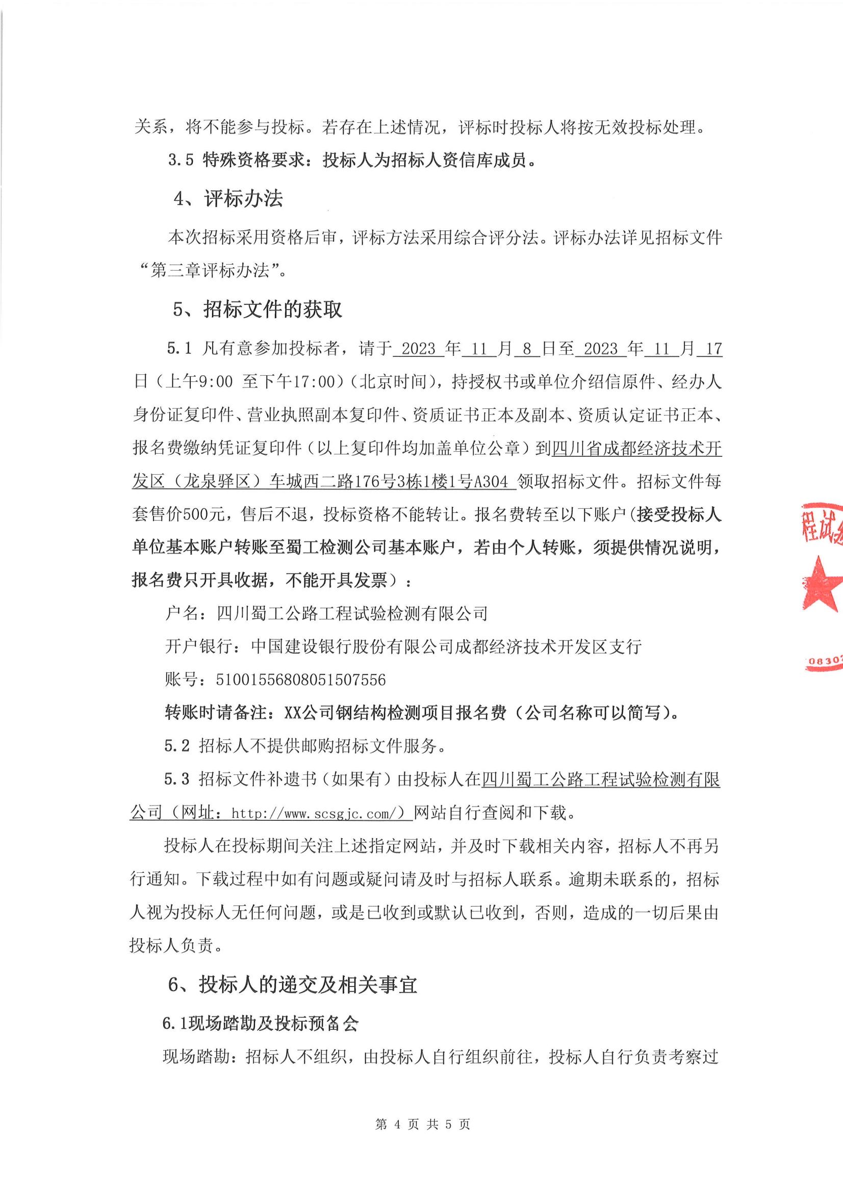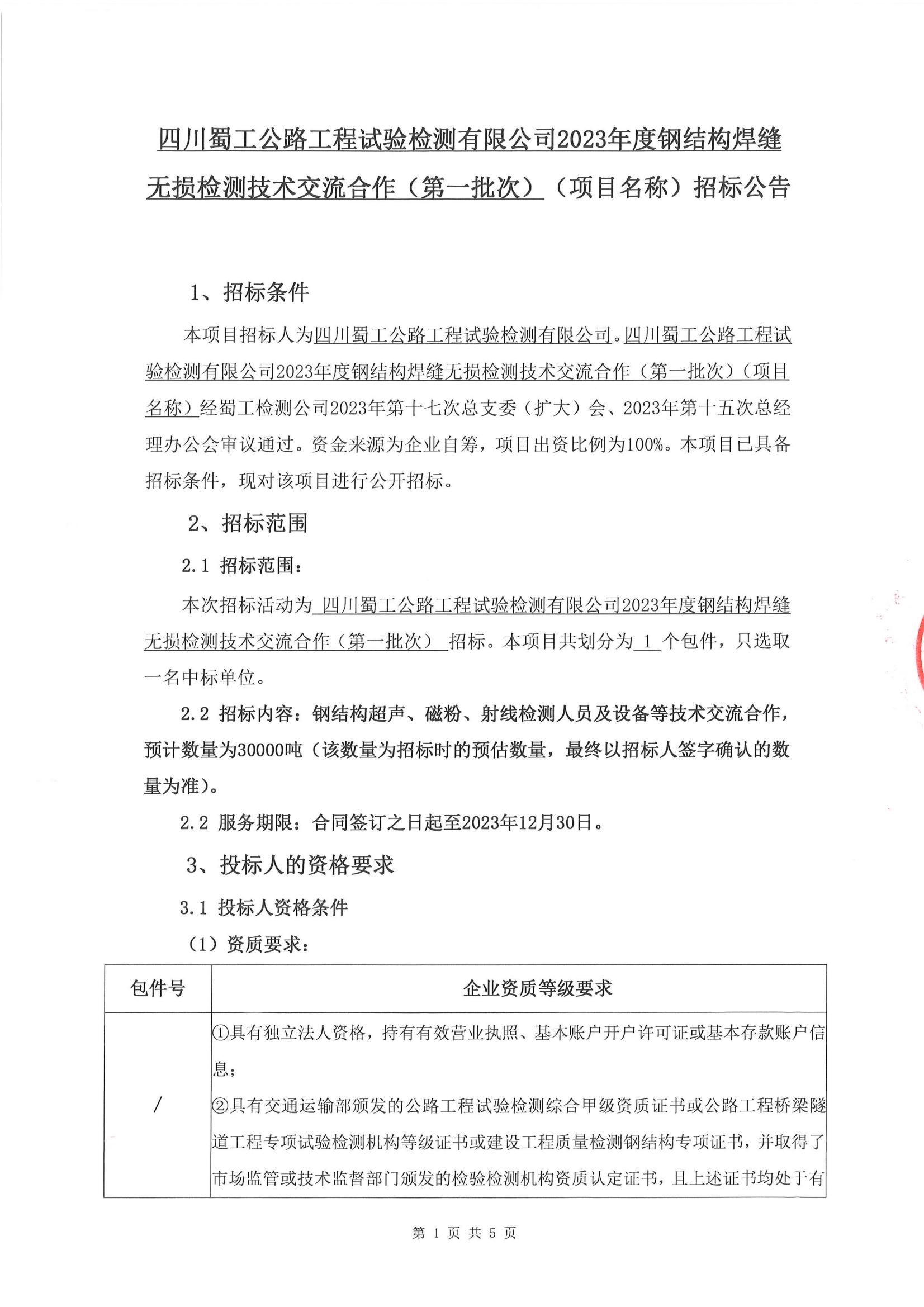 四川蜀工公路工程試驗檢測有限公司2023年度鋼結構焊縫無損檢測技術交流合作(第一批次)招標公告