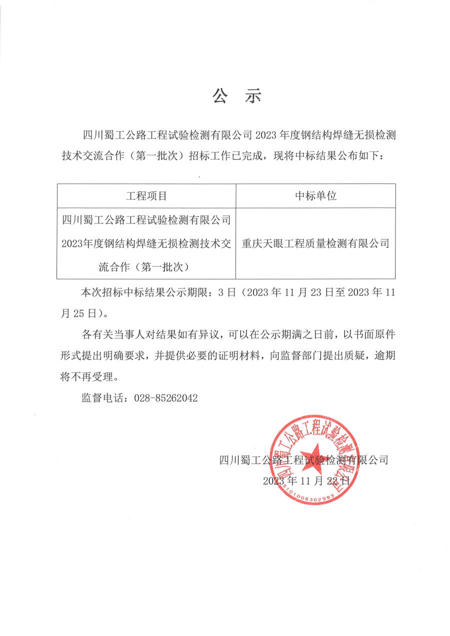 四川蜀工公路工程試驗檢測有限公司2023年度鋼結構焊縫無損檢測技術交流合作(第一批次)中標公示