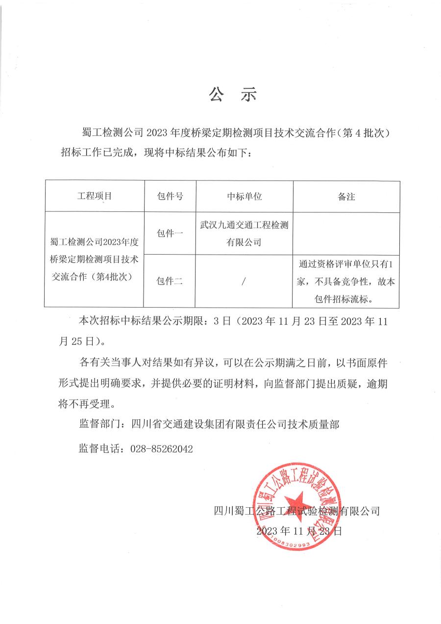 蜀工檢測公司2023年度橋梁定期檢測項目技術交流合作(第4批次)中標公示