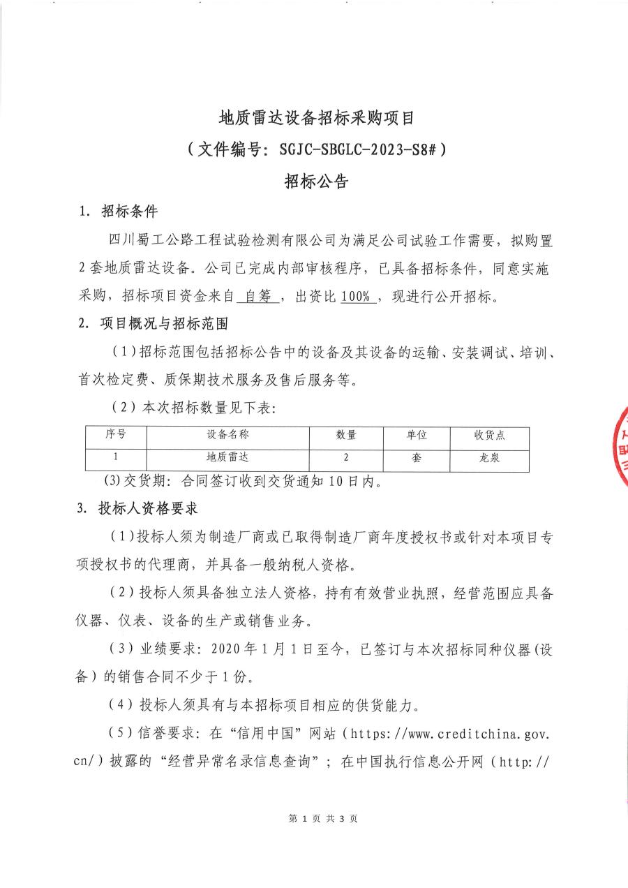 地質雷達設備招標采購項目(編號:SGJC-SBGLC-2023-S8#)招標公告