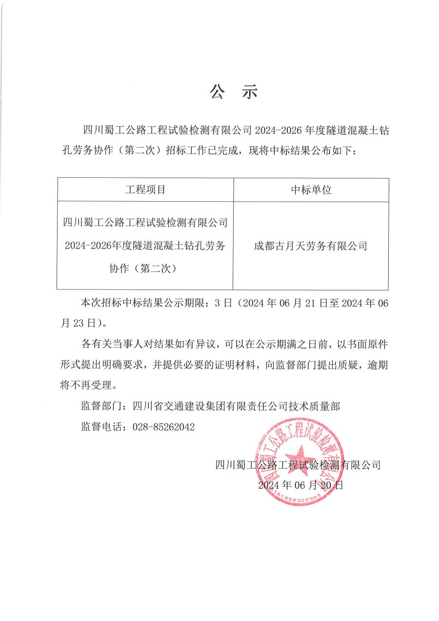 四川蜀工公路工程試驗檢測有限公司2024-2026年度隧道混凝土鉆孔勞務協作(第二次)中標公示