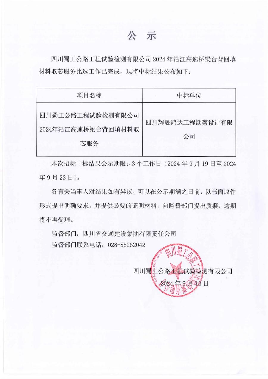 四川蜀工公路工程試驗檢測有限公司2024年沿江高速橋梁臺背回填材料取芯服務(wù)中標公示