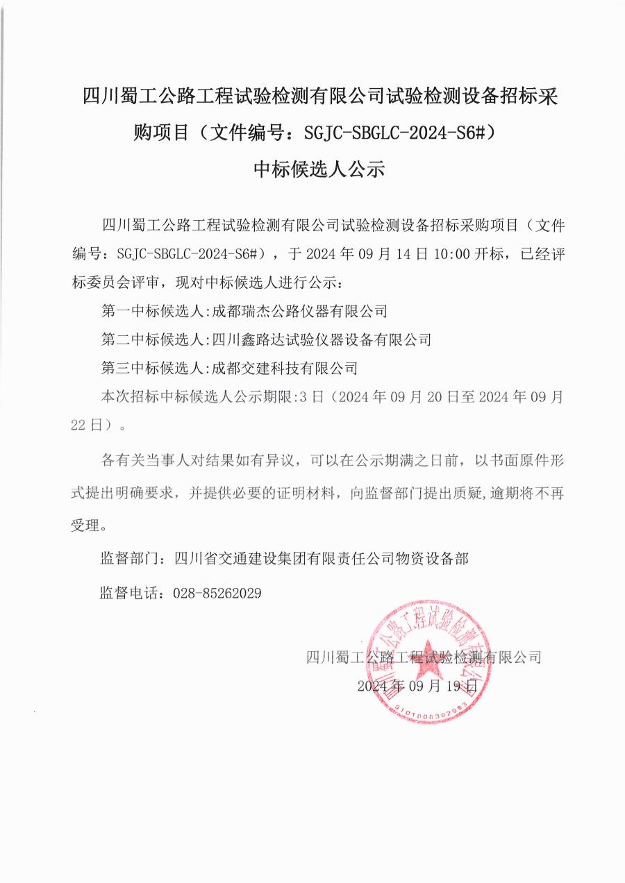 試驗檢測設備招標采購項目(文件編號:SGJC-SBGLC-2024-S6#)中標候選人公示
