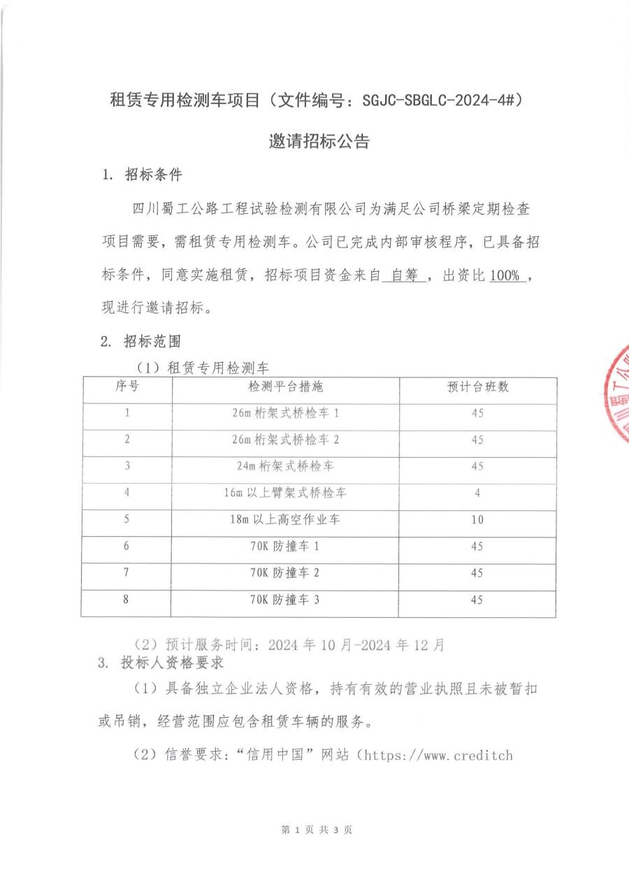 租賃專用檢測車項目(文件編號:SGJC-SBGLC-2024-4#)邀請招標公告