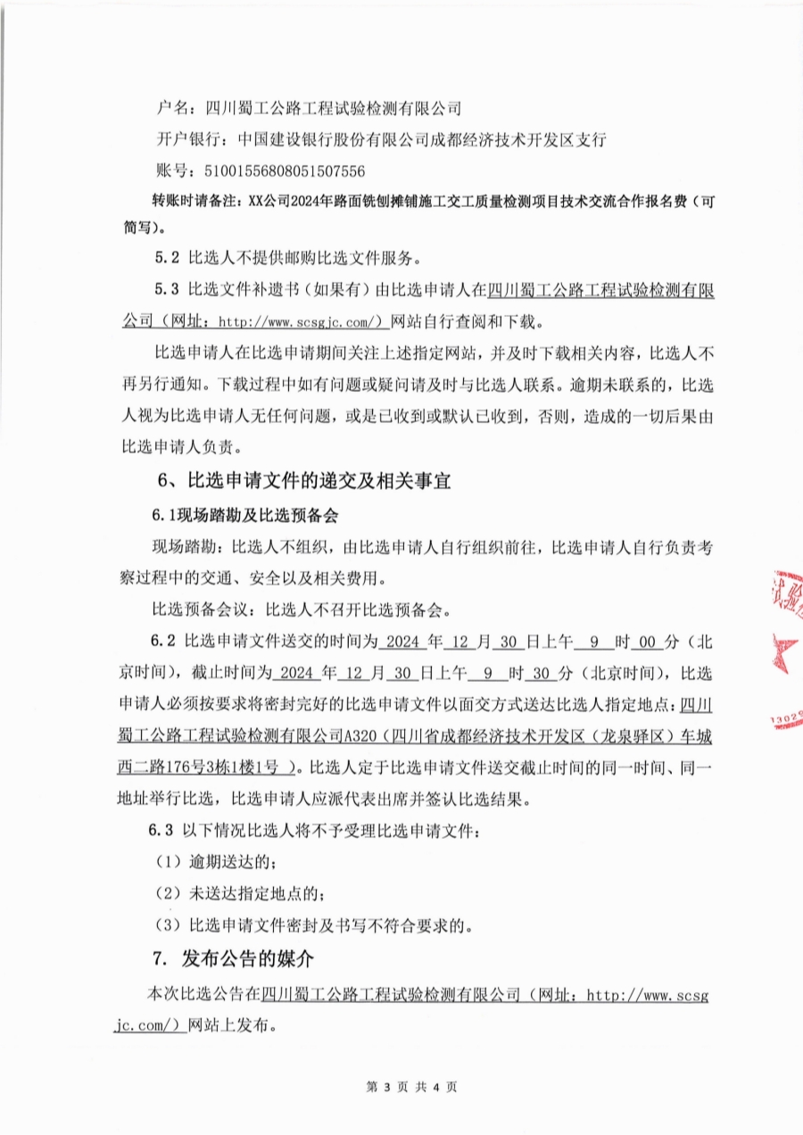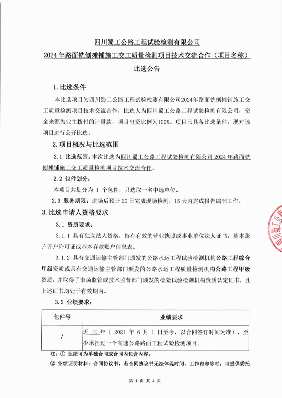 四川蜀工公路工程試驗檢測有限公司2024年路面銑刨攤鋪施工交工質量檢測項目技術交流合作比選公告