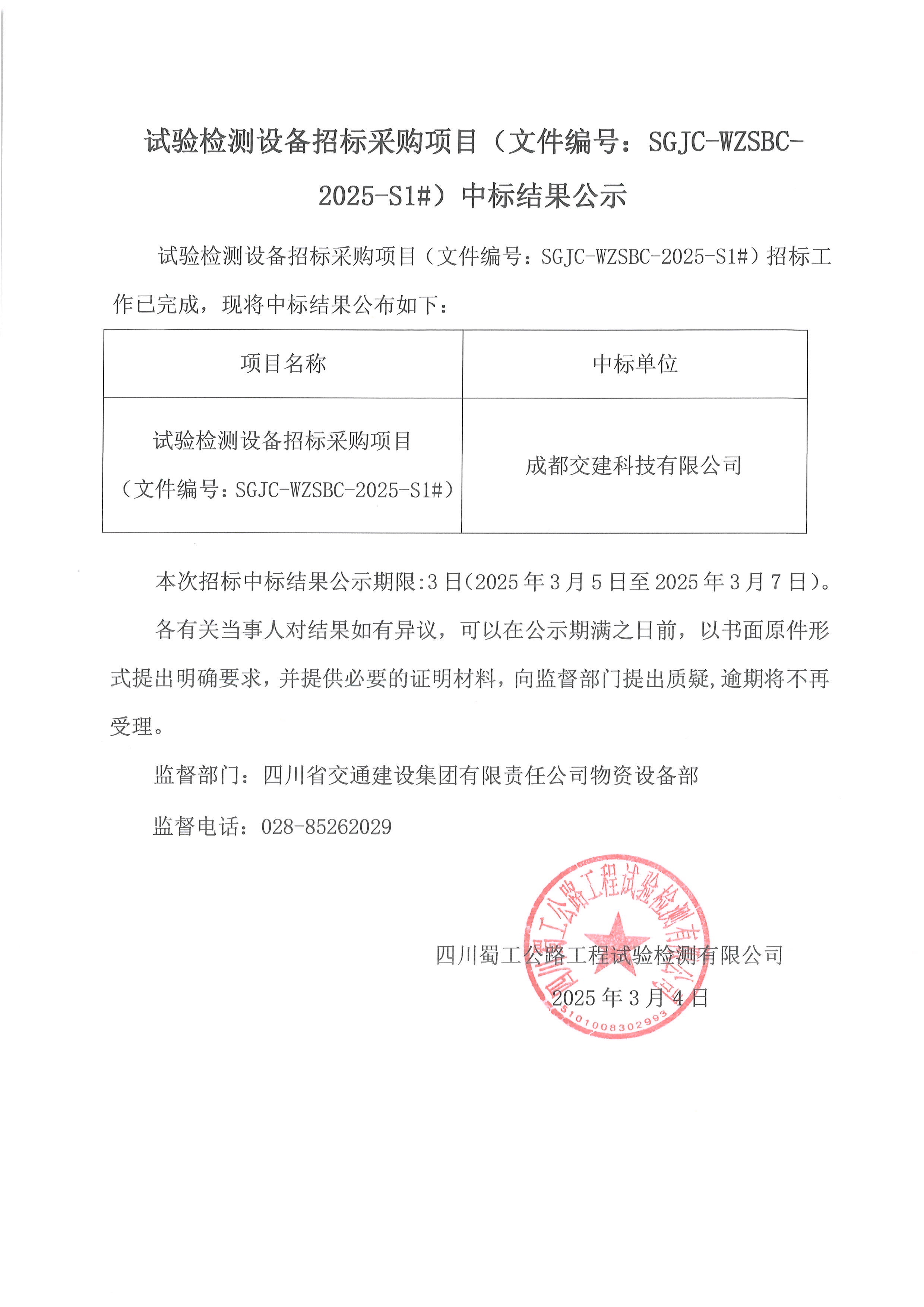 試驗(yàn)檢測設(shè)備招標(biāo)采購項(xiàng)目(文件編號:SGJC-WZSBC-2025-S1#)中標(biāo)結(jié)果公示