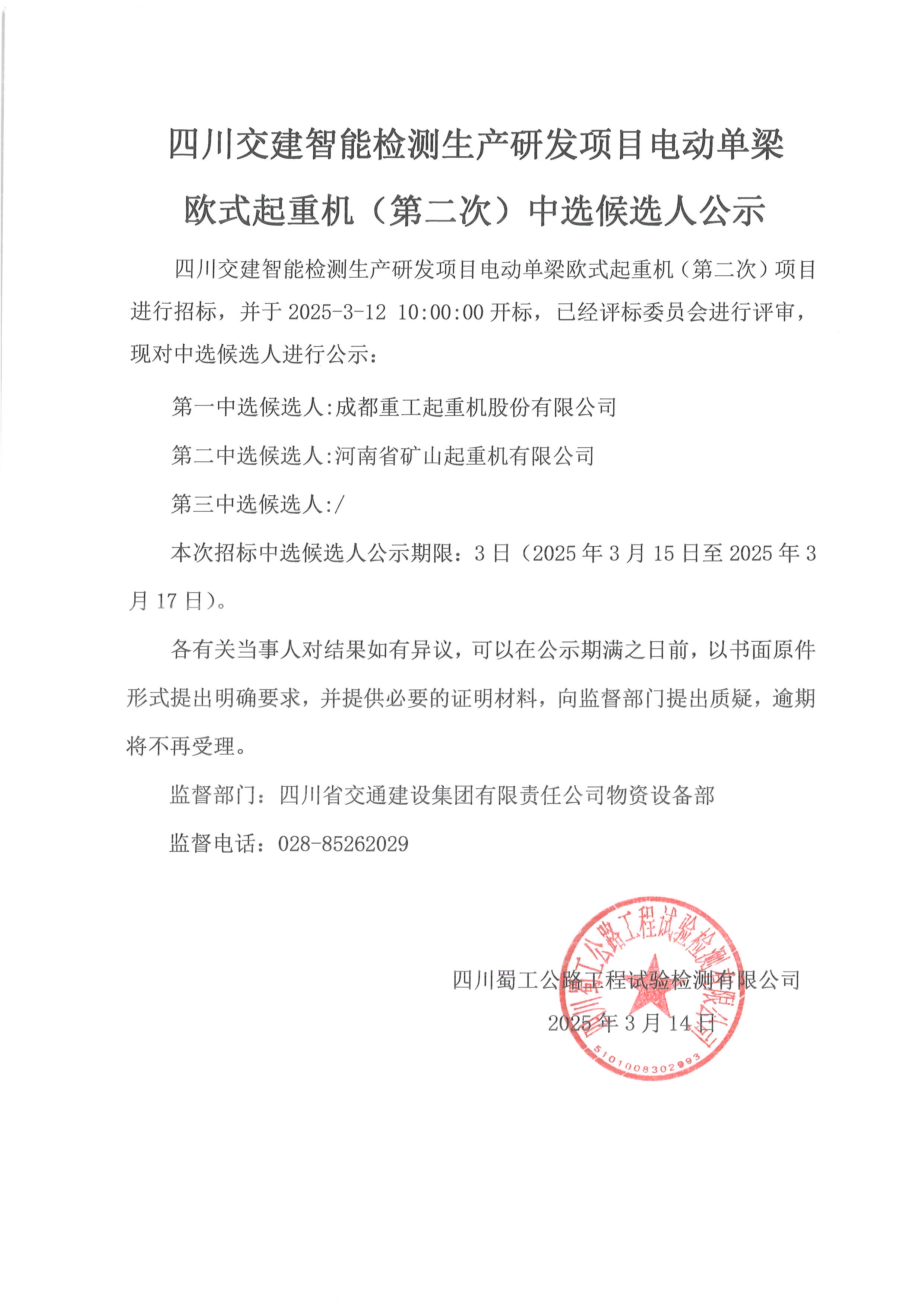 四川交建智能檢測生產研發項目電動單梁歐式起重機(第二次)中選候選人公示