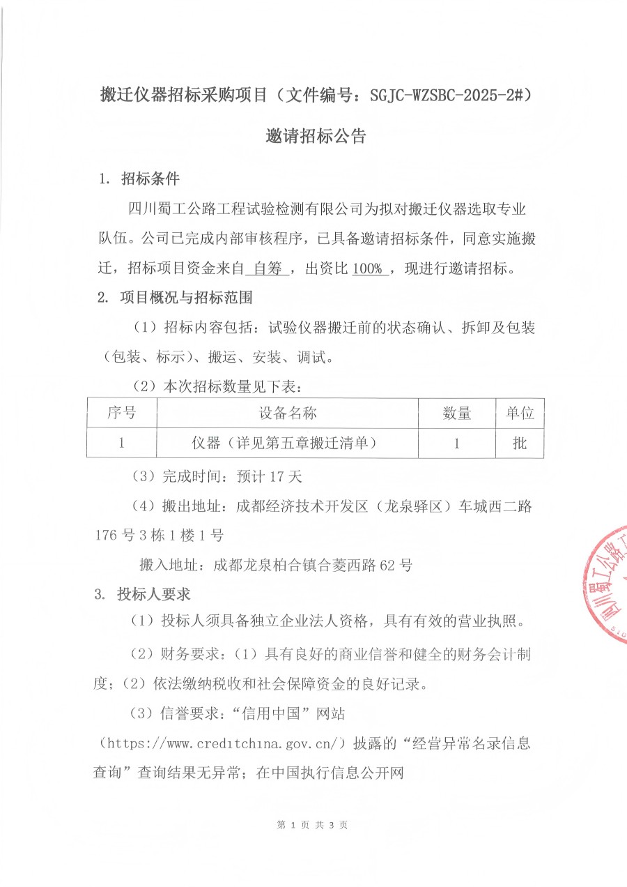 搬遷儀器招標采購項目(文件編號:SGJC-WZSBC-2025-2#)邀請招標公告