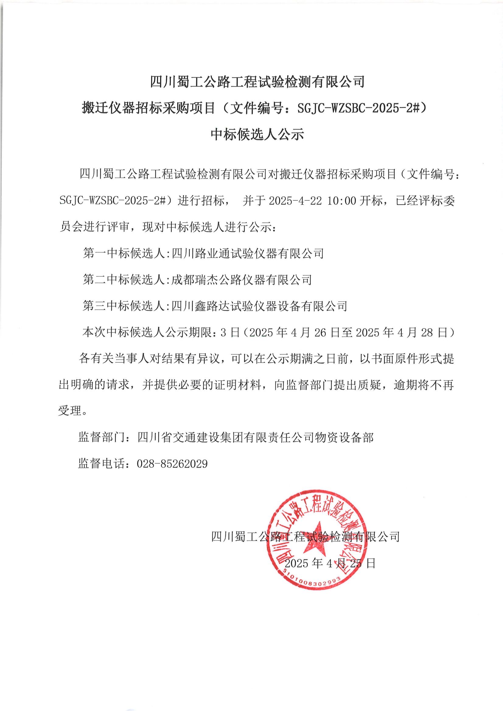 搬遷儀器招標采購項目(文件編號:SGJC-WZSBC-2025-2#)中標候選人公示
