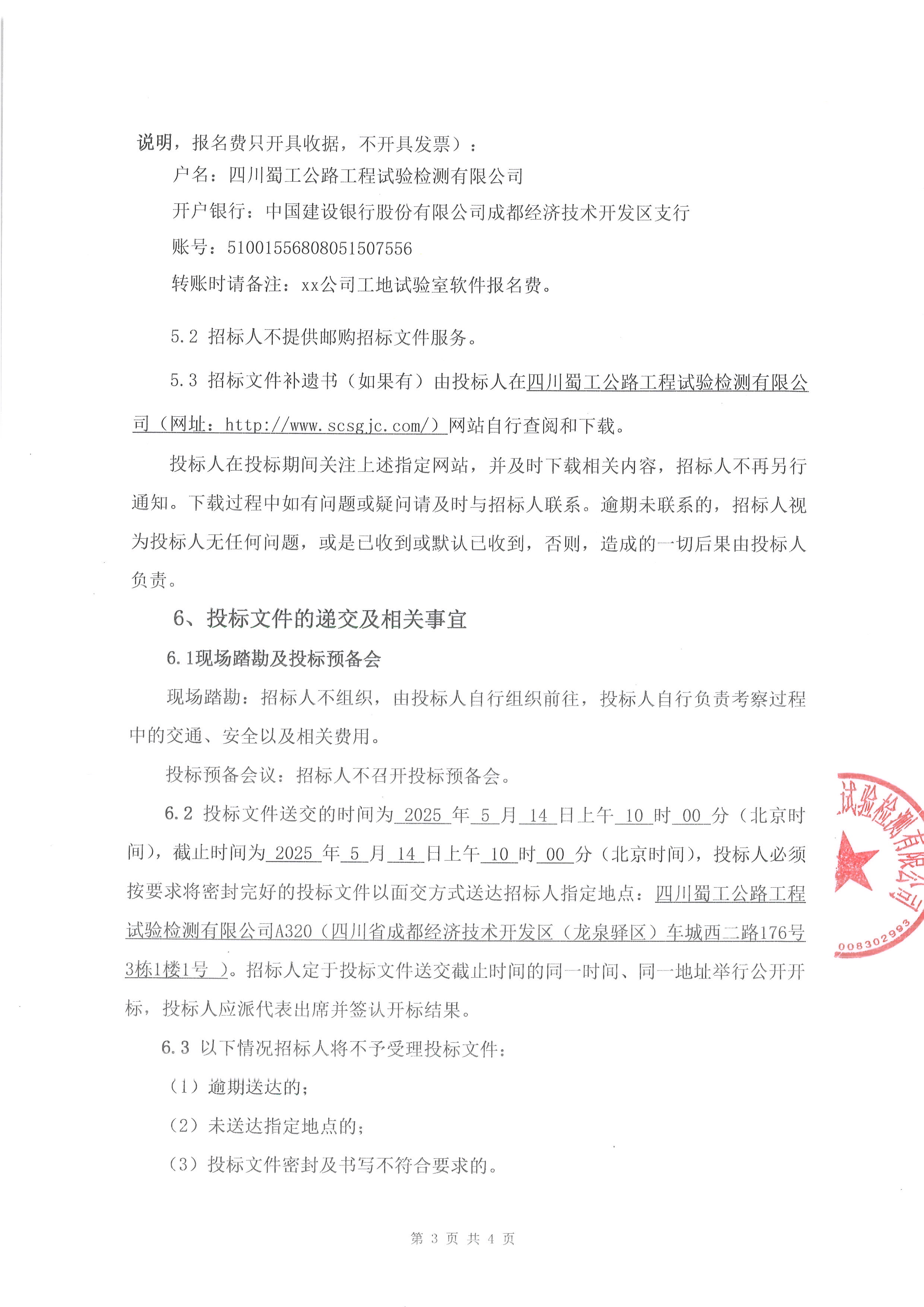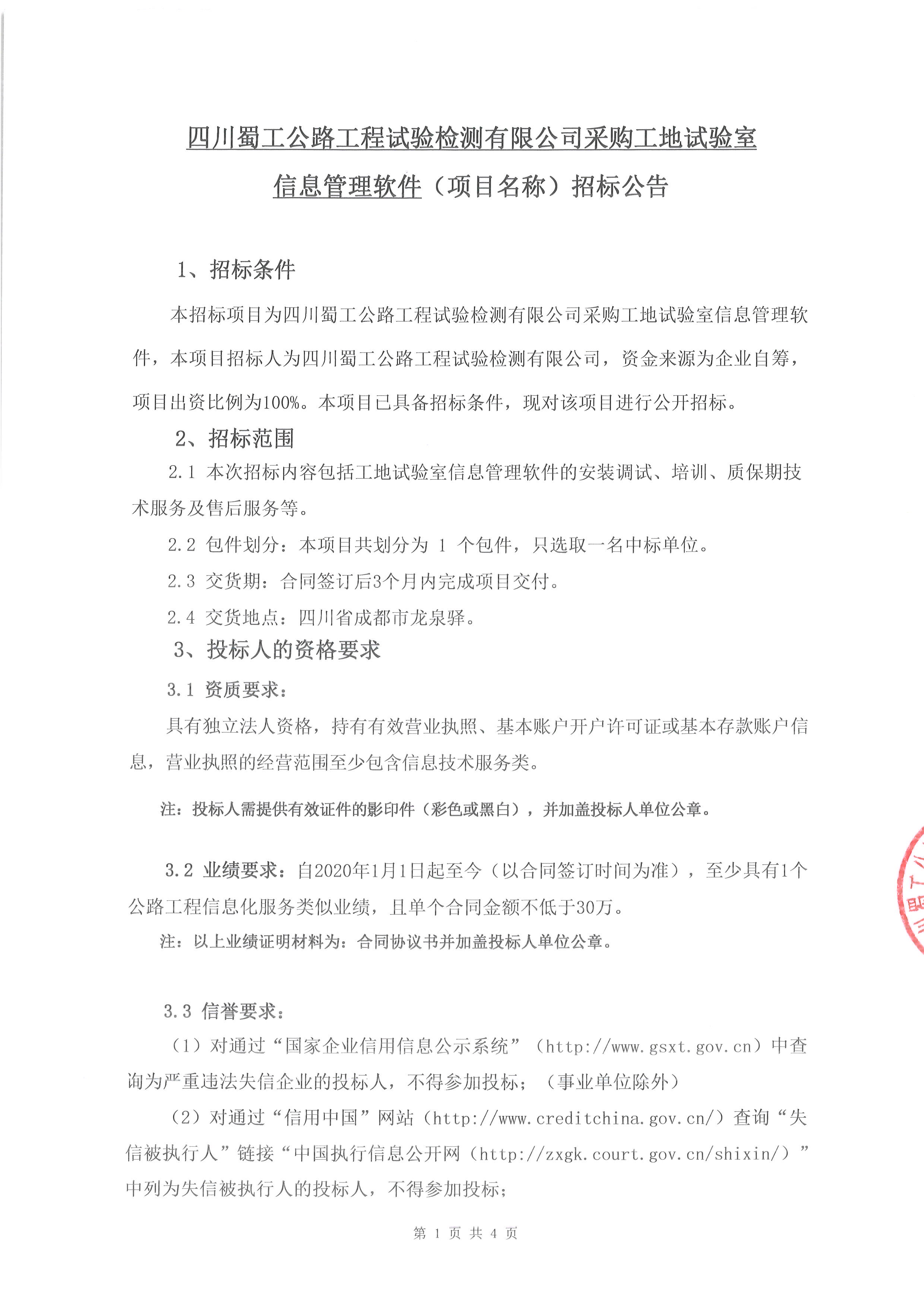 四川蜀工公路工程試驗檢測有限公司采購工地試驗室信息管理軟件招標公告