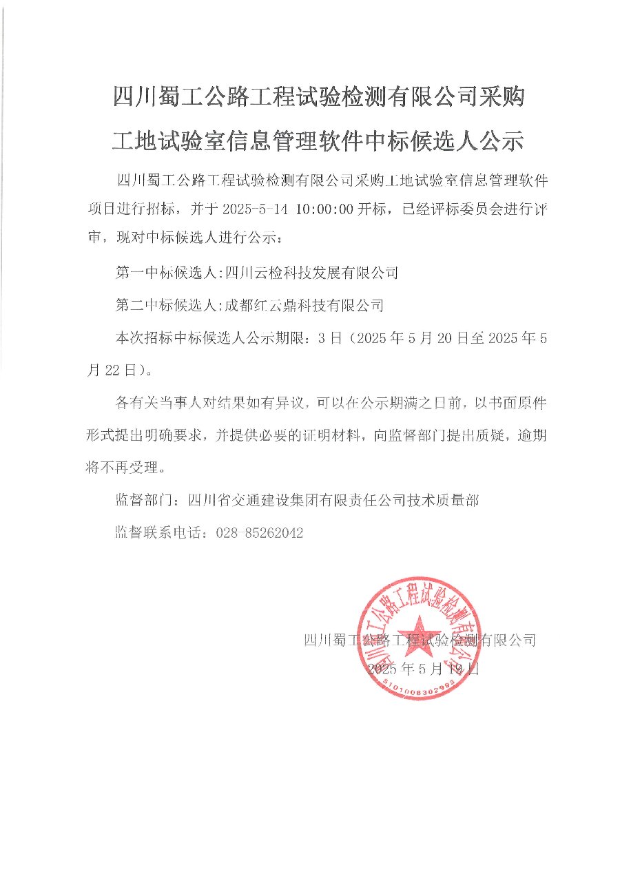 四川蜀工公路工程試驗檢測有限公司采購工地試驗室信息管理軟件中標候選人公示