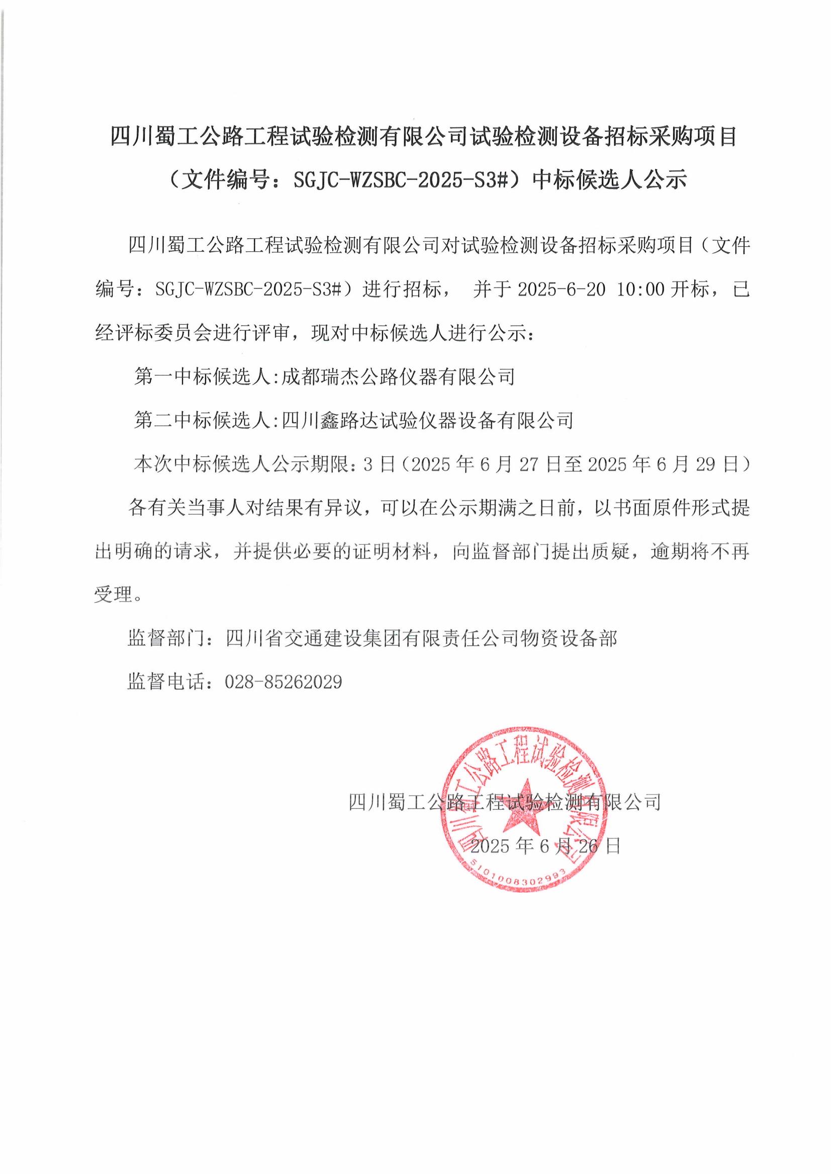 試驗檢測設備招標采購項目(文件編號:SGJC-WZSBC-2025-S3#)中標候選人公示