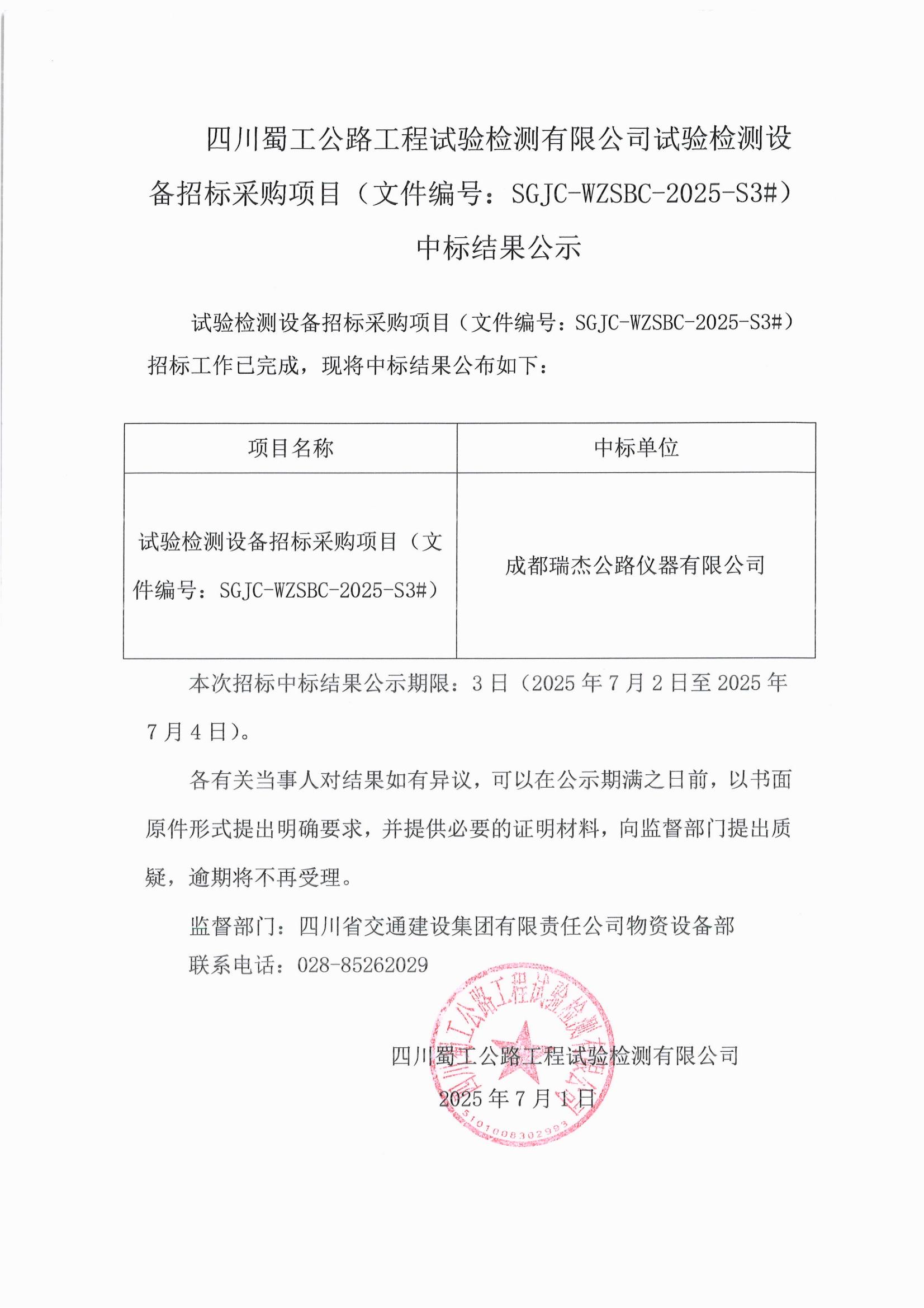 試驗檢測設(shè)備招標采購項目(文件編號:SGJC-WZSBC-2025-S3#)中標結(jié)果公示