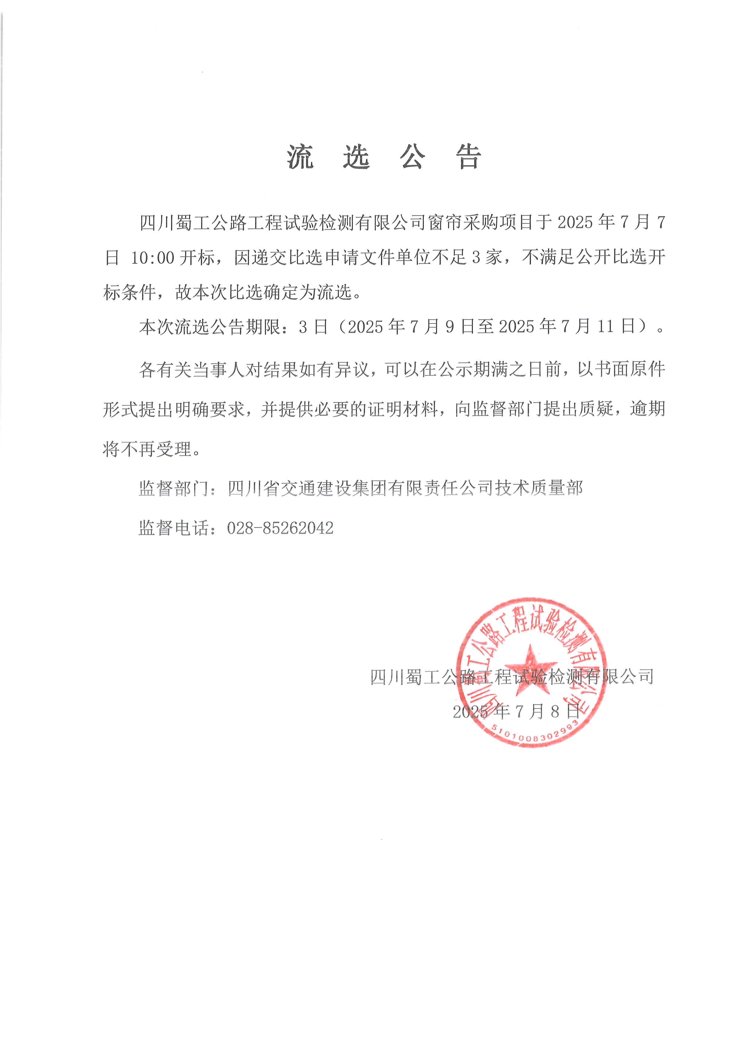 四川蜀工公路工程試驗檢測有限公司窗簾采購流選公告