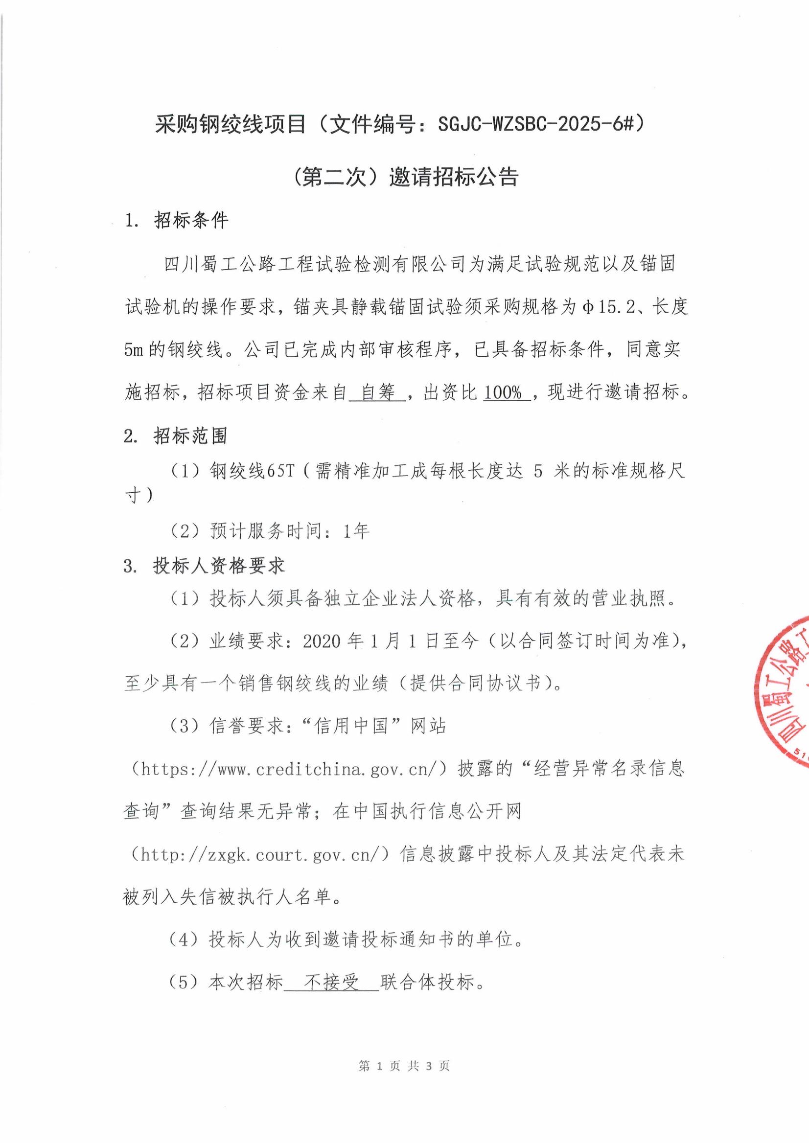 采購鋼絞線項目(文件編號:SGJC-WZSBC-2025-6#)(第二次)邀請招標(biāo)公告