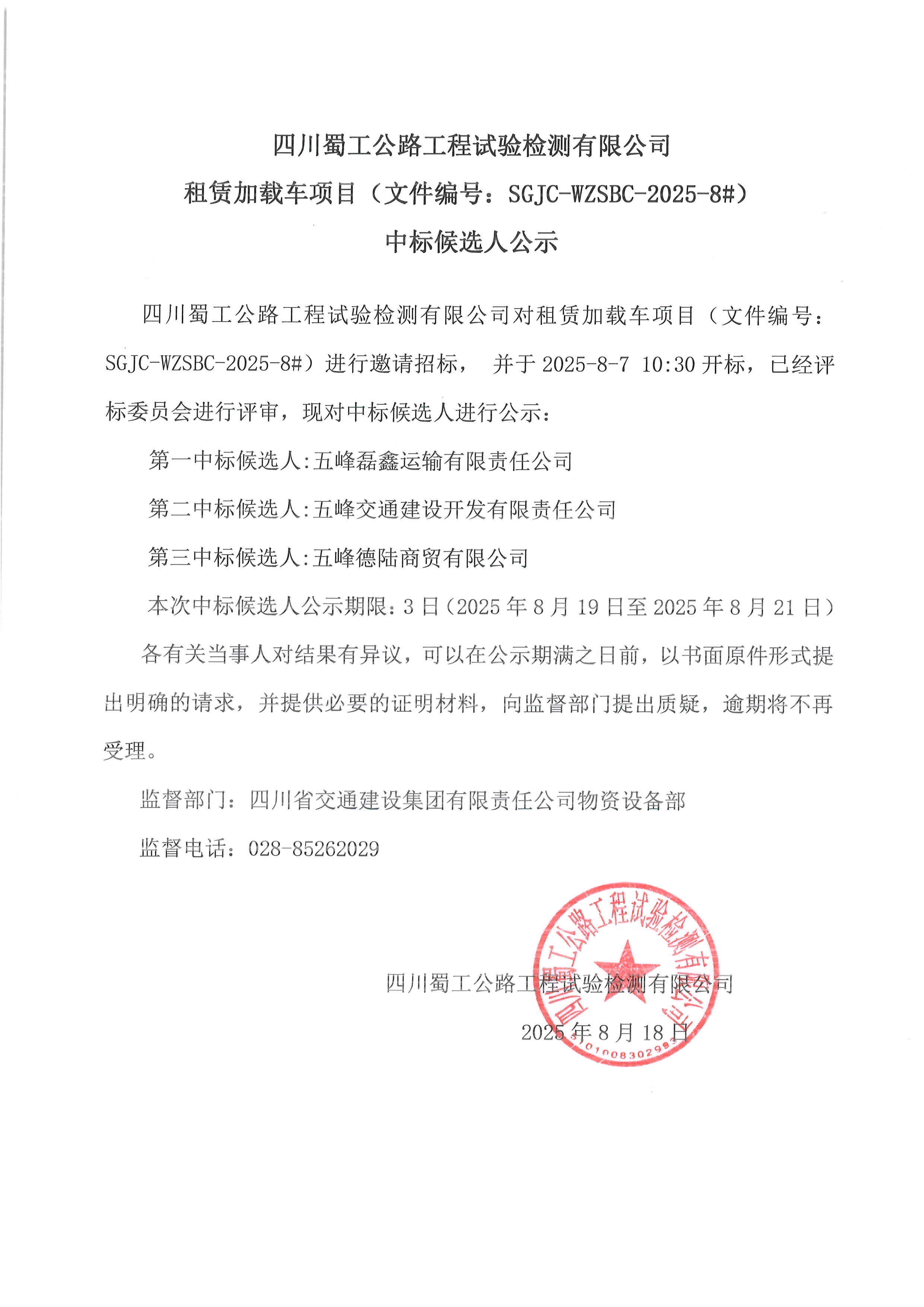 四川蜀工公路工程試驗檢測有限公司租賃加載車項目(文件編號:SGJC-WZSBC-2025-8#)中標候選人公示