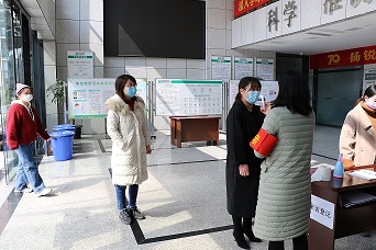 進入辦公樓,黨員、青年志愿者協助檢測,入口井然有序