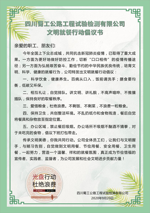 近日,習近平總書記做出“堅決制止餐飲浪費行為切實培養節約習慣”的重要指示。餐桌文明是人類文明的縮影,以文明、科學、健康的就餐行為,弘揚艱苦奮斗、勤儉節約的中華民族優良傳統是每個人應盡的責任。因此,檢測公司在開展節約糧食“光盤行動”的同時,以9.20公民道德宣傳日為契機,發出一封致全體職工的文明就餐行動倡議書,讓“節約光榮、浪費可恥”的觀念在身邊蔚然成風。