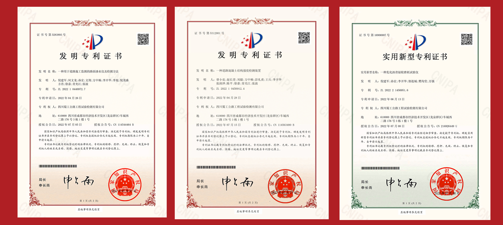 “十四五”時期,以新發展理念為指引,蜀工檢測公司向著科技強企目標奮勇前進,自2020年被科技部火炬中心認定為高新技術企業以來,在科技創新領域精耕細作,執著探索,努力在新材料研發,檢測技術進步,設備改造等方面取得新突破,推動公司在重要科技領域實現跨越式發展。近日,首次取得《一種用于道路施工監測的路面滲水儀及監測方法》《一種道路混凝土結構強度檢測裝置》2項發明專利,并新取得《一種乳化瀝青濕輪磨耗試驗儀》實用新型專利。