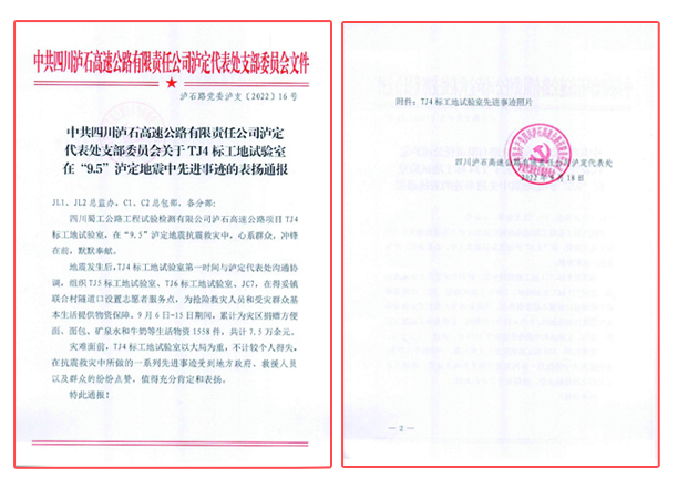 2022年9月18日,四川瀘石高速公路有限責(zé)任公司瀘定代表處對(duì)蜀工檢測(cè)公司TJ4標(biāo)工地試驗(yàn)室在“9.5”瀘定地震中所做的一系列抗震救災(zāi)先進(jìn)事跡表示充分肯定,并在JL1、TJ2總監(jiān)辦、C1、C2總包部、各分部范圍內(nèi)進(jìn)行了通報(bào)表揚(yáng)。