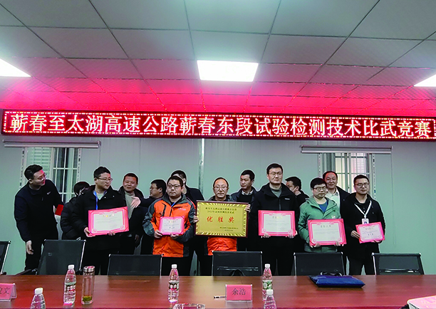 2023年2月17日-18日,為弘揚(yáng)勞模精神和工匠精神,促進(jìn)蘄春至太湖高速公路蘄春東段項(xiàng)目試驗(yàn)檢測(cè)人員提升技術(shù)水平,提高試驗(yàn)檢測(cè)工作的及時(shí)準(zhǔn)確性,打牢項(xiàng)目質(zhì)量管理良好基礎(chǔ),湖北交投蘄太東高速公路有限公司組織項(xiàng)目全線各施工、監(jiān)理單位共四家試驗(yàn)室開(kāi)展試驗(yàn)檢測(cè)技術(shù)比武活動(dòng)。蜀工檢測(cè)公司蘄春東段總監(jiān)辦工地試驗(yàn)室在本次比賽中,以綜合成績(jī)排名第一的優(yōu)異成績(jī),榮獲“團(tuán)體優(yōu)勝獎(jiǎng)”。